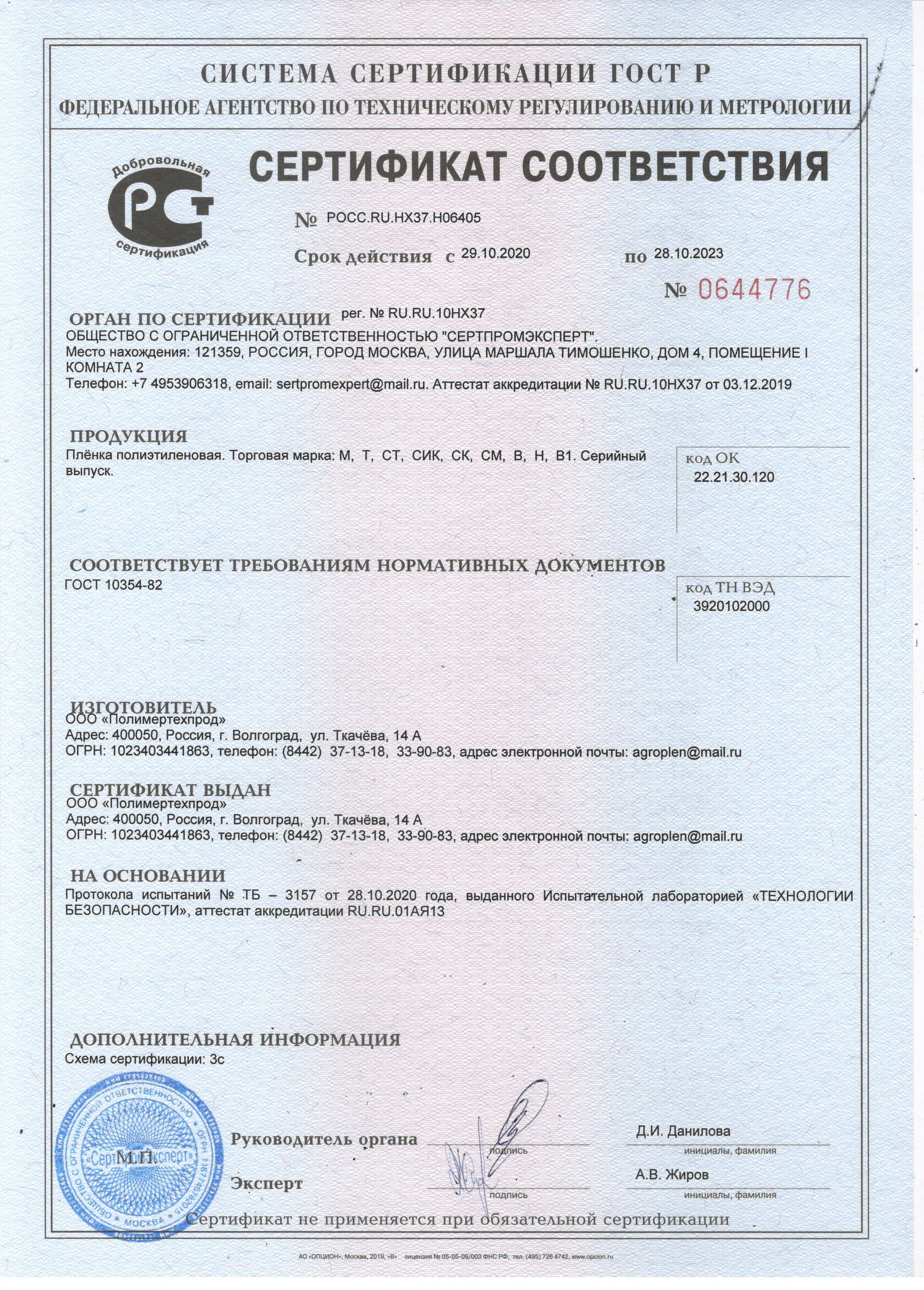 Сертификат соответствия (упаковка полимерная для пищевой продукции: плёнка полиэтиленовая)