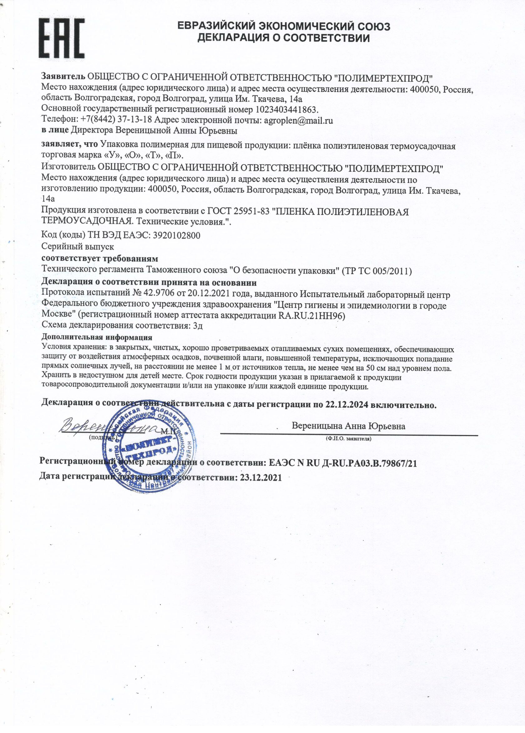Декларация о соответствии (упаковка полимерная для пищевой продукции: плёнка полиэтиленовая термоусадочная)