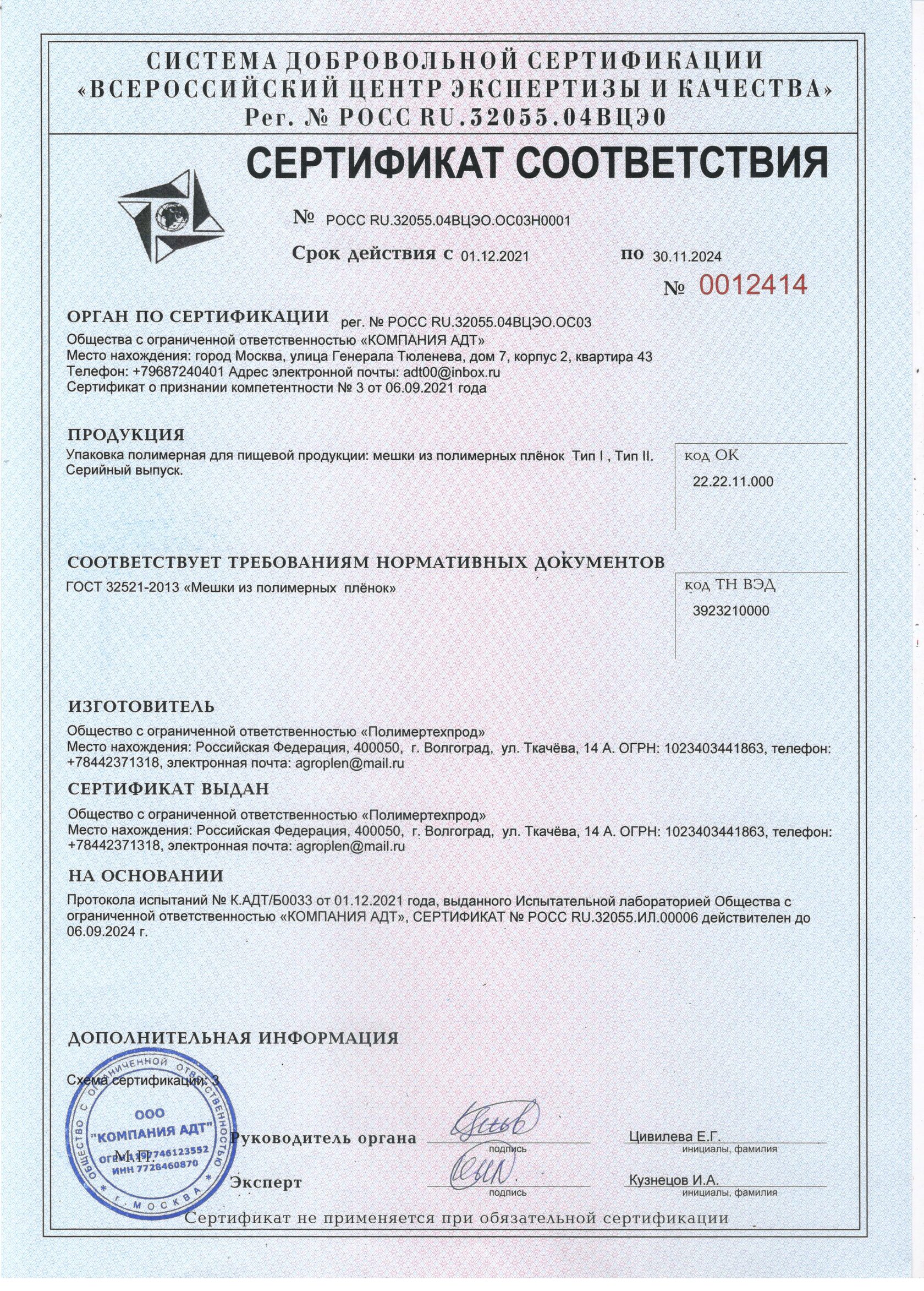 Сертификат соответствия (упаковка полимерная для пищевой продукции: мешки из полимерных плёнок)