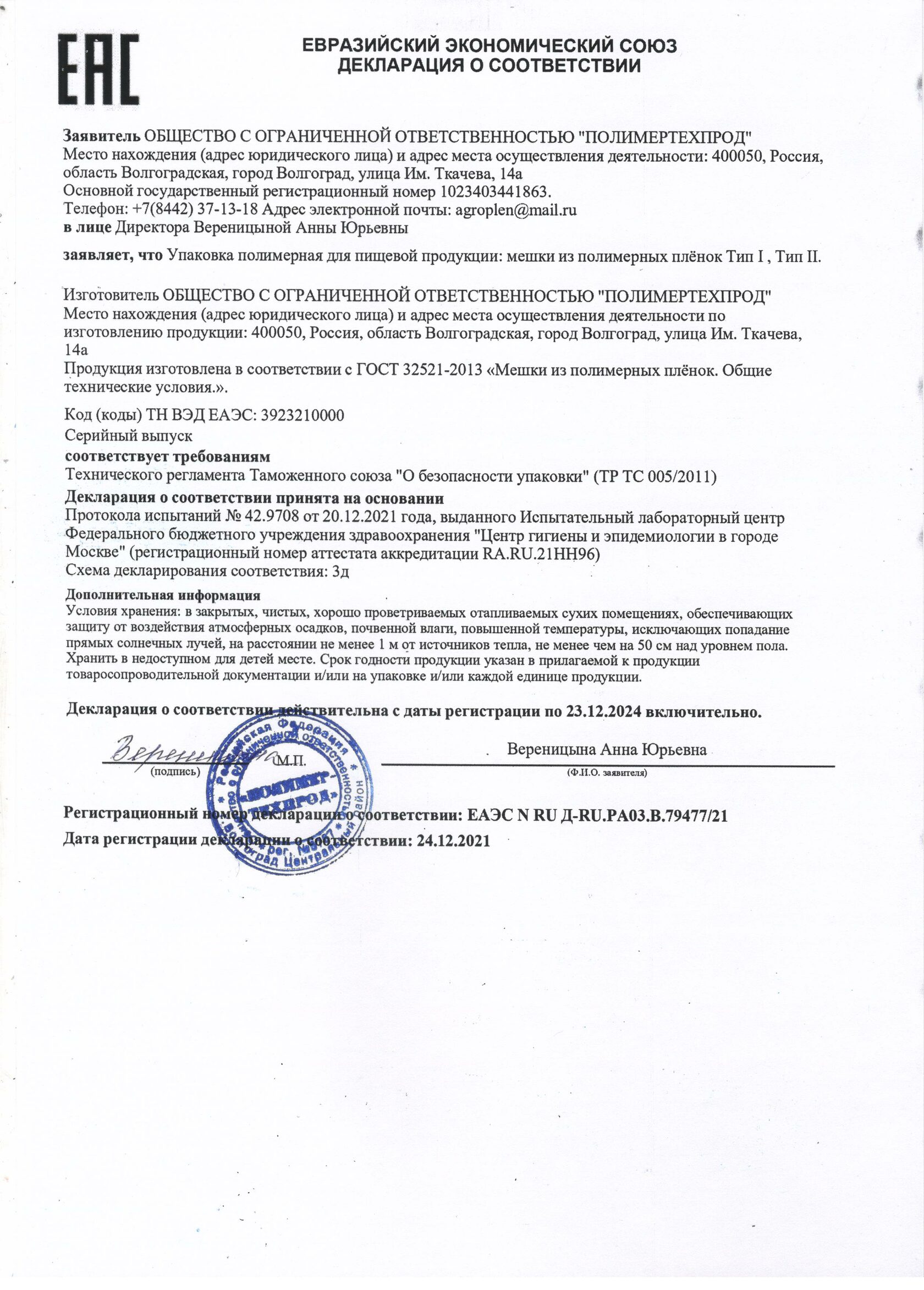 Декларация о соответствии (упаковка полимерная для пищевой продукции: мешки из полимерных плёнок)
