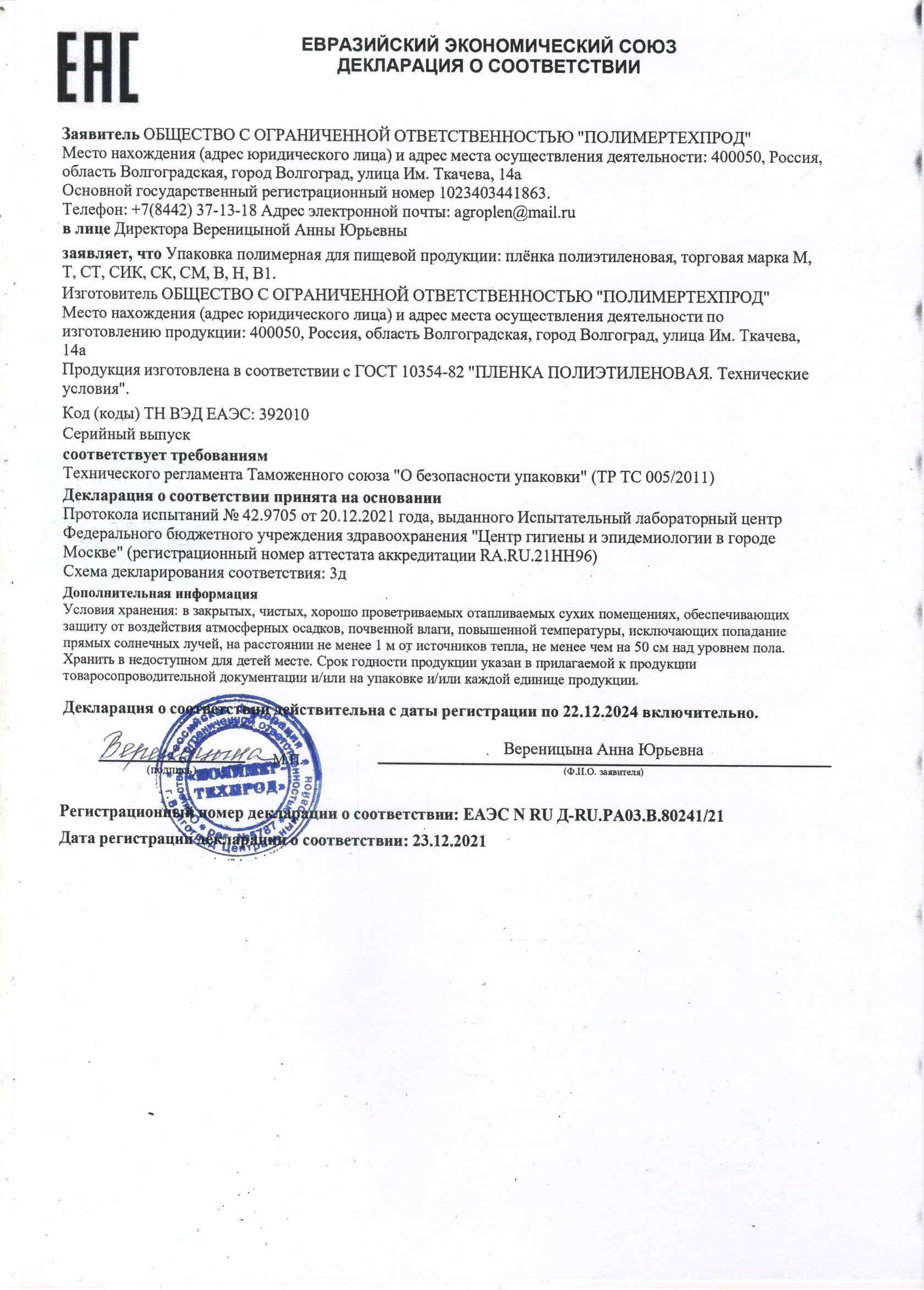 Декларация о соответствии (упаковка полимерная для пищевой продукции: плёнка полиэтиленовая)